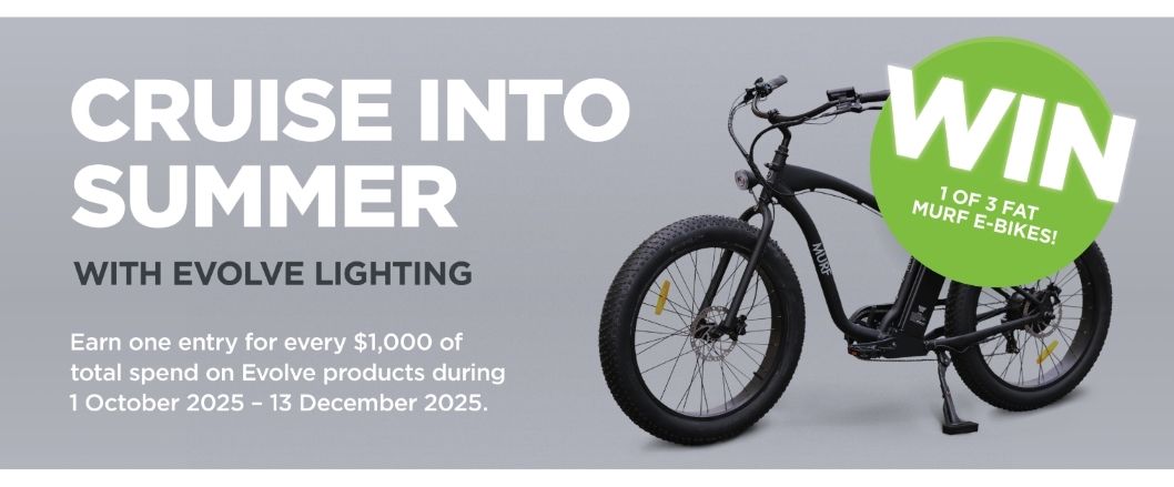 This offer is available instore and online during the promotional period. For every $1,000.00 + GST accumulated by purchasing stocked Evolve Lighting products, customers will receive one entry into the draw to win one of three Fat Murf E-Bikes.