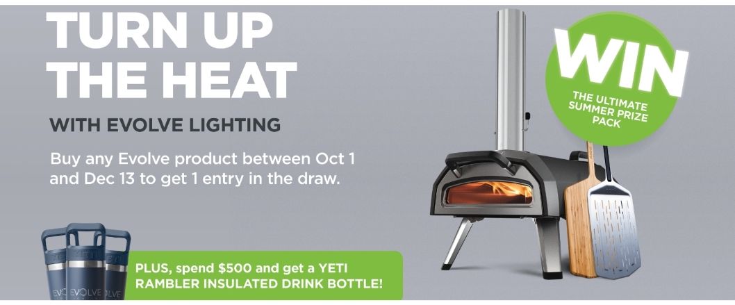 Customers who purchase any single Evolve Lighting stocked product during the promotion period, will also receive one entry in the draw to win an Ooni Karu 2 Multi-Fuel Pizza Oven valued at $954. Available at participating branches only.
