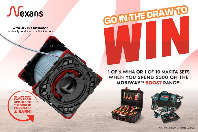The Nexans MOBIWAY™ BOOST range is an innovative cable installation system that pairs Nexans’ top‑selling building cables with a redesigned, reusable spool engineered to improve speed, safety, and efficiency on site. The system enables electricians to work smarter through smoother unspooling, integrated handles, stable stacking, and optimised cable lengths.